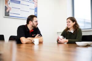 Als de koffie op tafel staat, vertelt Bente dat ze voorheen in de horeca werkte: “Een vriendin vertelde me over de vacature voor transportplanner bij Tielbeke. Ik besloot te solliciteren en kreeg ondanks mijn gebrek aan ervaring de baan”. Daniël, die tot dan toe aandachtig luistert, is verrast. “Ik zou nooit geraden hebben dat Bente uit de horeca komt”, aldus de vrachtwagenchauffeur.