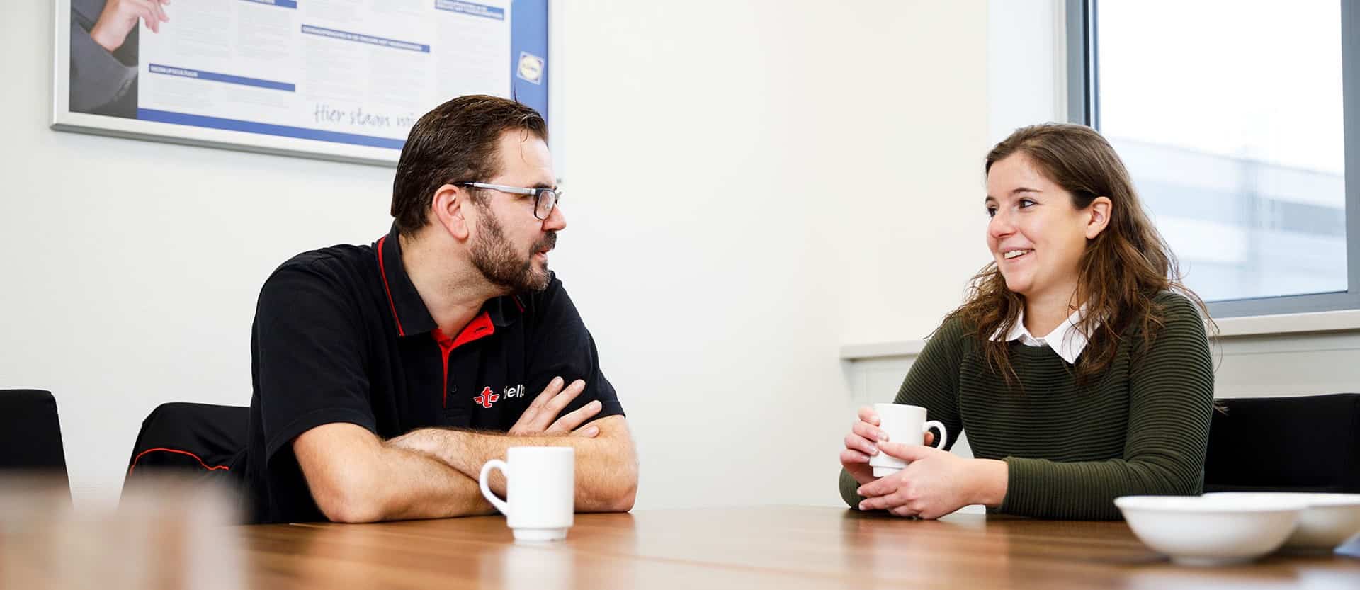 Als de koffie op tafel staat, vertelt Bente dat ze voorheen in de horeca werkte: “Een vriendin vertelde me over de vacature voor transportplanner bij Tielbeke. Ik besloot te solliciteren en kreeg ondanks mijn gebrek aan ervaring de baan”. Daniël, die tot dan toe aandachtig luistert, is verrast. “Ik zou nooit geraden hebben dat Bente uit de horeca komt”, aldus de vrachtwagenchauffeur.