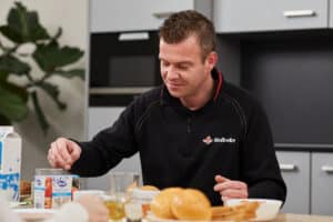 Collega Frank start met een kop thee en belegt een bol met ham en kaas. Zichtbaar genietend van het ontbijt vertelt hij dat hij normaal gesproken de dag niet op deze manier begint. “Vaak start ik met koffie en eet wat later op de ochtend maar hier kan ik wel aan wennen hoor! Tijdens de vakantie ontbijt ik graag uitgebreid, bijvoorbeeld een Oostenrijks ontbijt is heel lekker.”